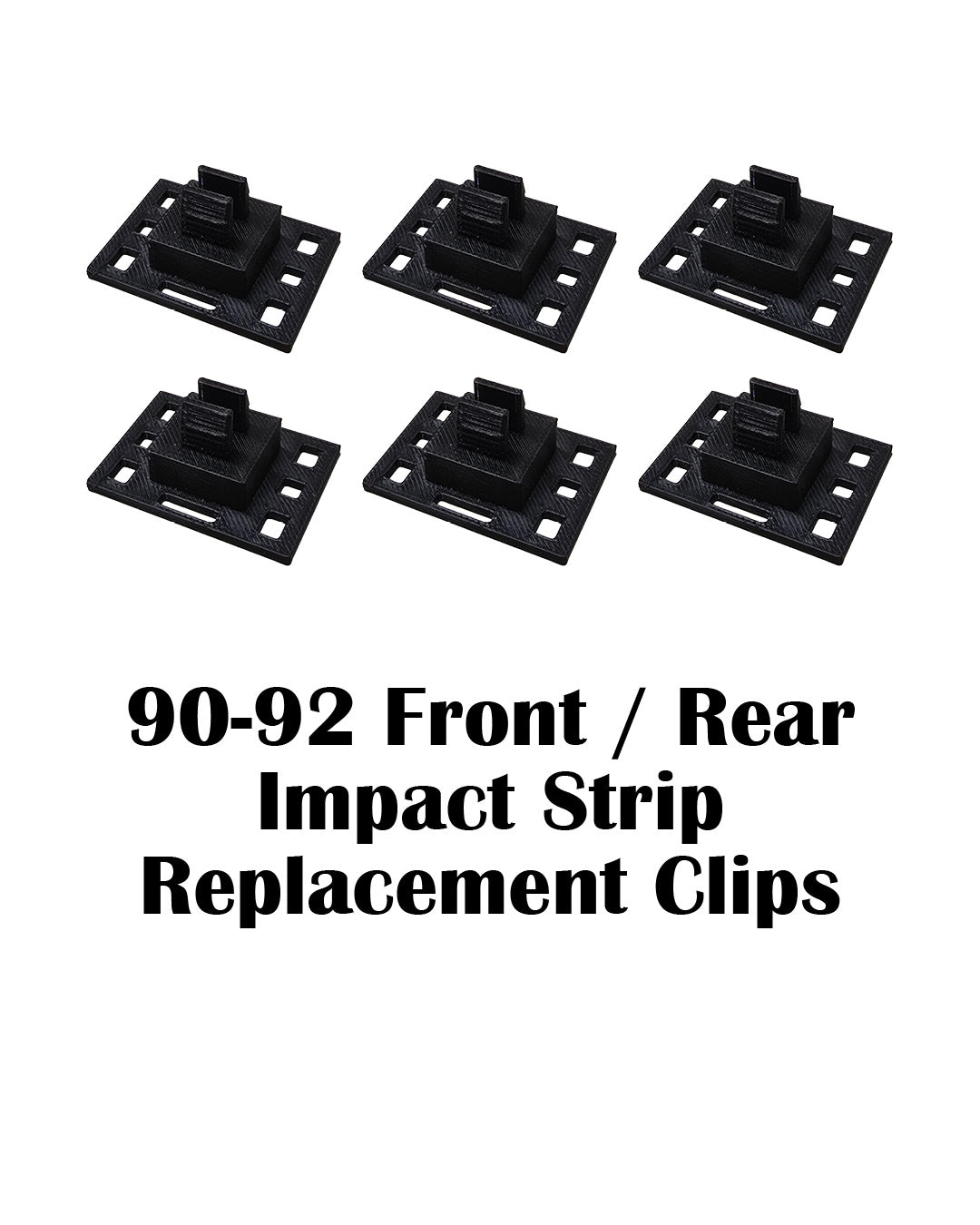 These replace the broken tabs on the back of the front and rear bumper impact strip for the 1990, 1991, 1992 Cadillac Brougham Euro style cladding trim moulding. There are three tabs per side of the front impact strips. There's six middle clips on the rear impact strip that these can replace. Please select a quantity to receive a discount!